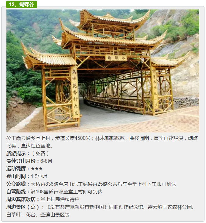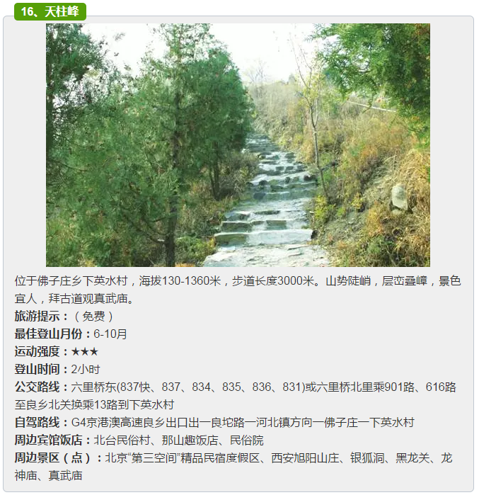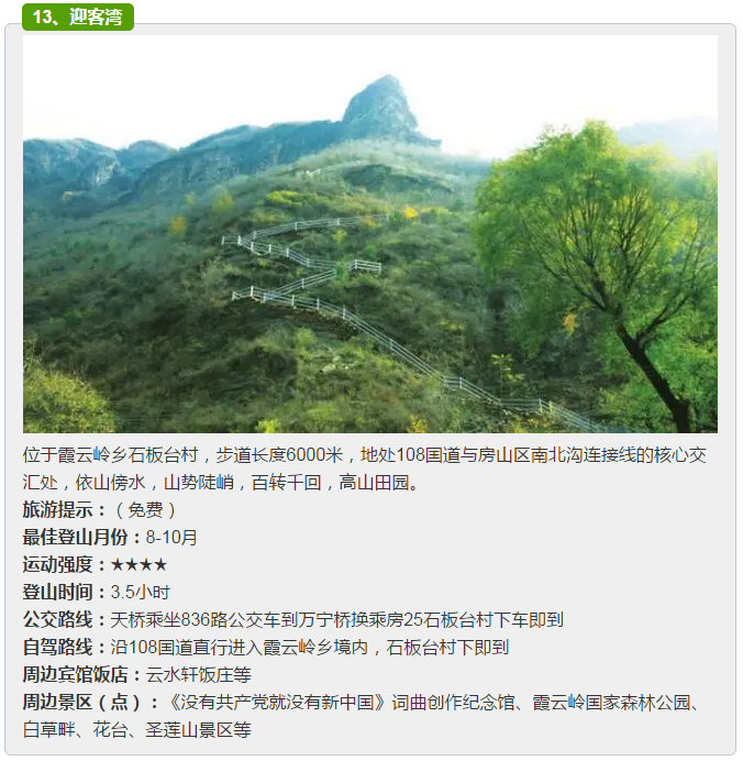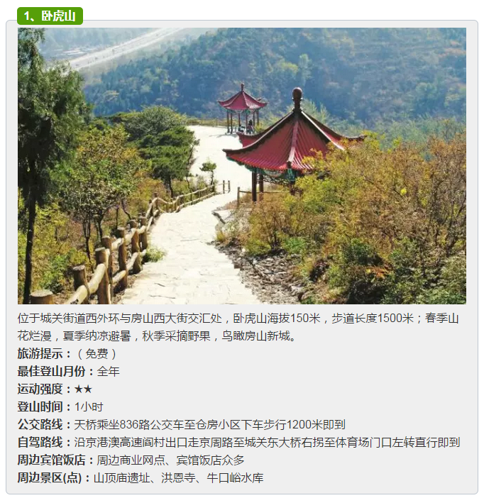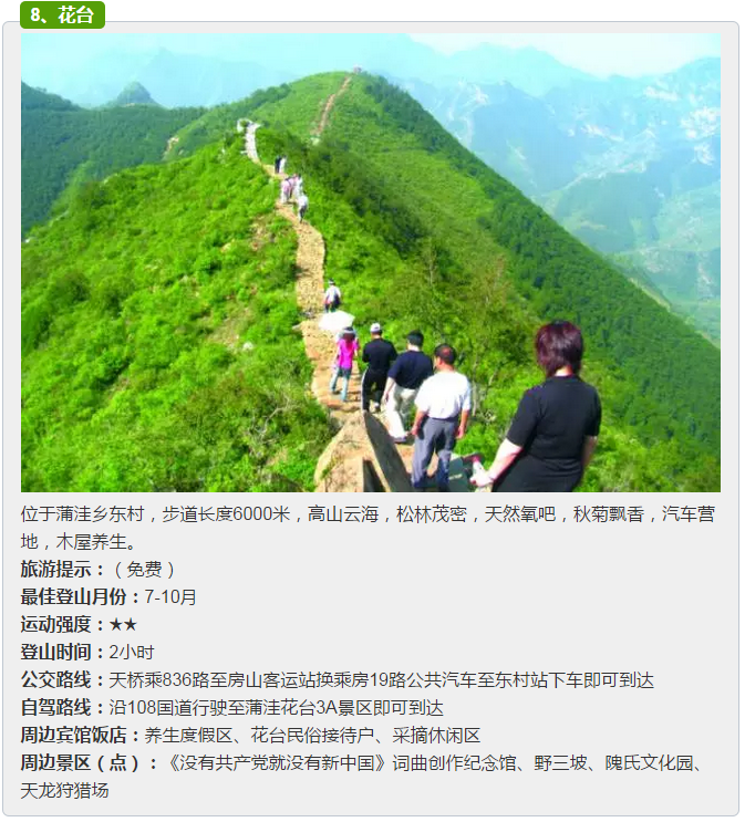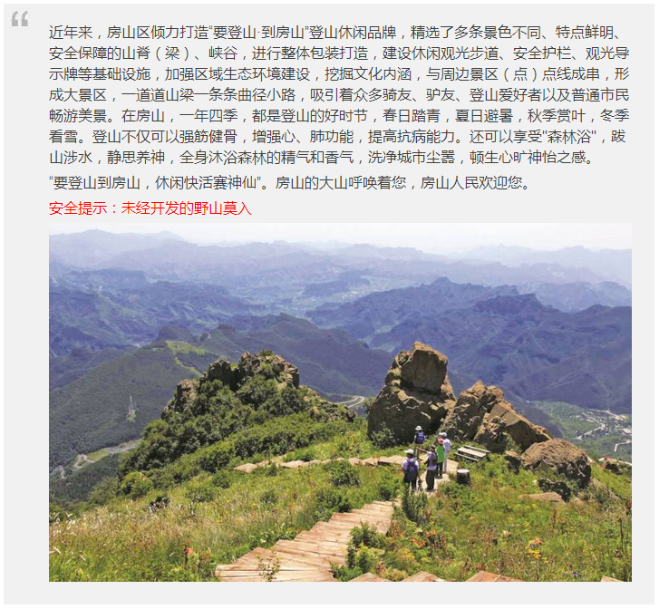 “十三五”期间我区拟建30条登山步道:日前,区农委牵头制定完成了《房山区“十三五”登山步道建设规划》,将在现有建成登山步道基础上,再修建30条登山步道,“十三五”末总数量达到55条,总长度约600公里,进一步打造“要登山·到房山”品牌。