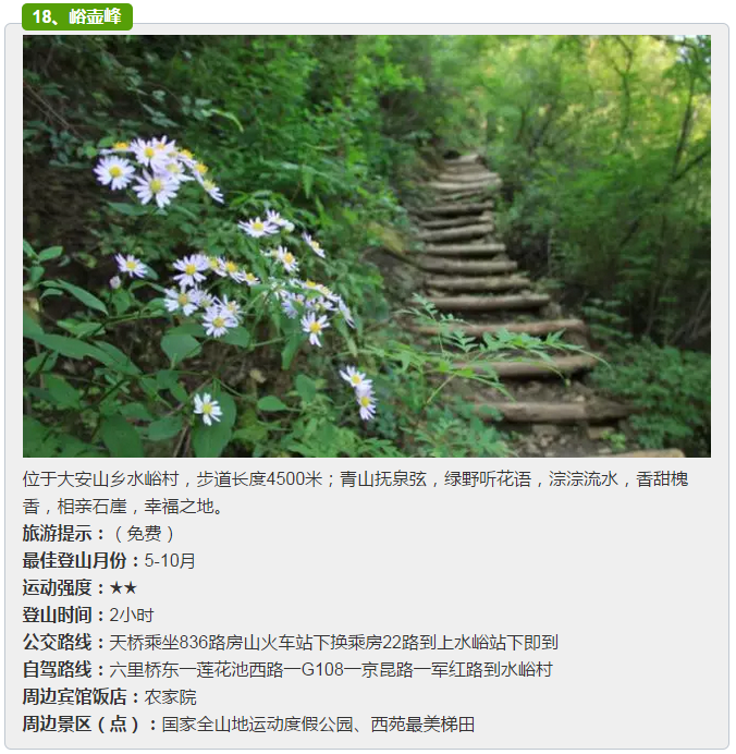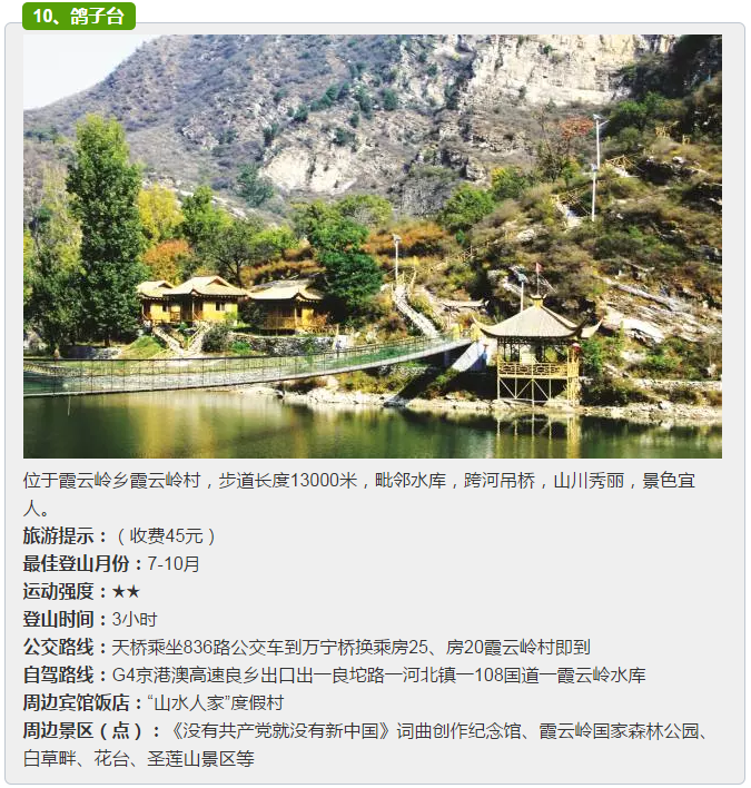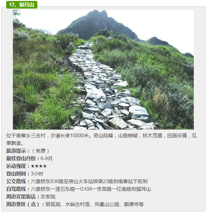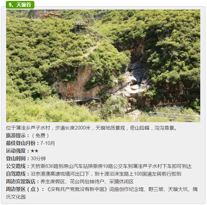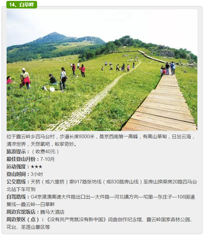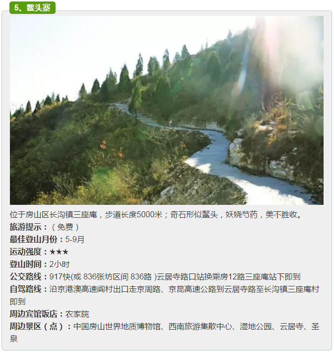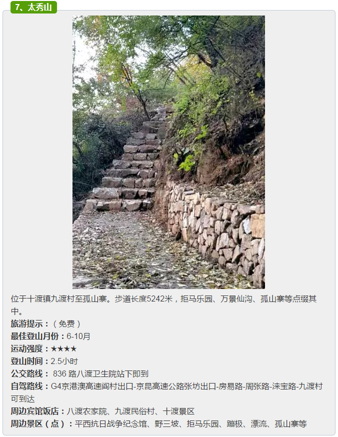 “十三五”期间我区拟建30条登山步道:日前,区农委牵头制定完成了《房山区“十三五”登山步道建设规划》,将在现有建成登山步道基础上,再修建30条登山步道,“十三五”末总数量达到55条,总长度约600公里,进一步打造“要登山·到房山”品牌。